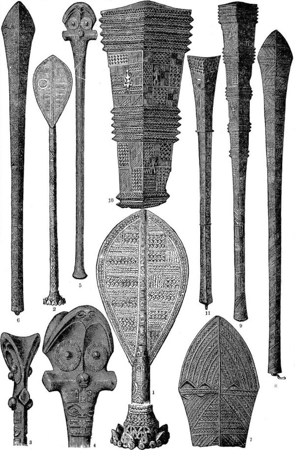 Оружие и утварь полинезийцев отличаются обилием и разнообразием (см. табл. «Оружие и украшения полинезийцев»). Только у меланезийцев встречается ещё большее развитие художественной умелости и изобретательности. Отсутствие железа здесь преимущественно бросается в глаза. Когда европейцы впервые пришли в соприкосновение с полинезийцами, у последних недостаток металлов заменялся камнем, костями и раковинами. Большая часть полинезийских островов лишена руды: на коралловых островах иначе и быть не может, и во многих случаях то же самое замечается на вулканических. Но культурная ступень этих народов такова, что они наверно дошли бы до пользования металлами, если бы находили их в сыром виде. Из камней, костей, зубов и дерева они делали почти всё, что только можно было сделать. Орудия для судоходства и рыболовства, лодки и удочки представляются вполне законченными в своём роде и выказывают не только техническое умение, но и дар изобретательности. Как только они узнали железо, они сумели, в противоположность австралийцам и бушменам, тотчас же воспользоваться им. Железо, без сомнения, также [202] употреблялось для украшения. Когда стеклянные бусы уже значительно утратили свою ценность, всё железное занимало первое место среди европейских товаров. Сперва они применяли его в старых, привычных формах: вместо раковины Tridacna они вставляли в свои топоры куски железных обручей и вообще продолжали придерживаться употребительной формы орудий. На Понапе, где конец каменного века можно отнести к началу 20-х годов, железные клинки всё ещё