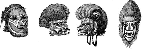 Применение маски в религиозных церемониях широко распространено во всех странах с господствующею формою политеистических верований; звериные и человеческие маски, чудовищные фигуры и сложные головные уборы применяются во всех религиозных действиях. В Китае, Тибете, Индии и Цейлоне, у древних мексиканцев и перуанцев (сравн. маски для умерших на таблице «Американские древности») они постоянно появляются так же, как и у эскимосов, меланезийцев (см. рис. стр. 55) и африканских негров. У алеутов вместе с умершими кладутся в гроб маски с комическим искажением черт, которое позволяет предположить, что это — танцевальные маски, некогда служившие суетной цели, а ныне связанные с серьёзными представлениями о жизни и возрождении после смерти. [55]
