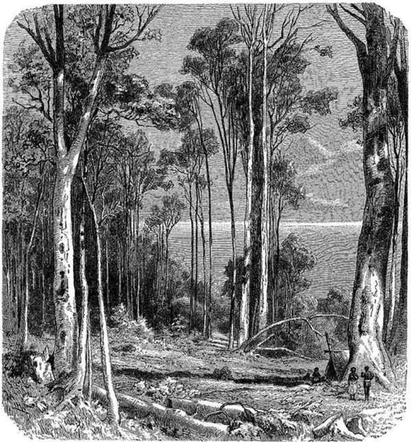 И наружный вид этой части света говорит о сухости. Австралийский растительный мир отличается сухостью и оцепенелостью, даже в наиболее счастливых полосах материка, где поднимаются высокие леса на берегах постоянных потоков. При значительно большем растительном богатстве, чем в Европе, Австралия имеет более однообразную, беднее выраженную флору. Она бедна лесами; не лес, а роща составляет здесь характерную форму совместного роста деревьев (см. рис., стр. 326). Травянистая местность, поросшая лесом, составляет столько же красивую, сколько и полезную особенность Австралии. На юго-востоке и на севере луга встречаются в довольно значительном распространении. На этом основана самая обширная и важная отрасль производительности Австралии — скотоводство. При увеличивающейся сухости трава растёт отдельными пучками и переходит в степь, а эта последняя становится пустыней при появлении бесплодной каменистой или солончаковой почвы. Австралийскую степь, в её наиболее враждебном человеку виде, представляет скруб, степь, поросшую непроходимым кустарником, где почва густо покрыта переплетшимися кустами Ericaceae и Proteaceae, над которыми местами возвышаются деревья. Обычная высота этих кустарных степей, занимающих многие квадратные мили, всё-таки значительнее, чем высота наших вересковых пространств. Лесные саванны называли благословением этой страны, а скруб — её [328] проклятием. Лейхгардт, Стурт, Стюарт и др. целые недели и даже месяцы обходили скруб, не находя дороги через него или выше его. Другая степь, покрытая травою спинифекс (Festuca irritans), представляет привлекательную картину необозримых зрелых хлебных полей, но в действительности она принадлежит к самым пустынным и опасным областям: стебли травы здесь сухи и не питательны, жестки и остры. Если, таким образом, при оценке удобств Австралии по отношению к культуре, мы назовём этот материк скорее большой степью, чем пустыней, то всё-таки эти труднодоступные степи, по крайней мере, на долгое время (а для туземцев и во всякое время) составляют большое препятствие для продовольствия и для движения. Однако, там, где степь в местностях дюн, на солончаковых или каменистых пространствах переходит в пустыню и засыхает, картина её редко бывает столь же безотрадною, как в больших пустынях Старого Света. Почти нигде она не лишена вовсе растительного покрова. Подобием её может служить небольшая степь Калахари. Сахара несравненно обнажённее её, но в ней замечается не только смена каменных плоскогорий и песчаных равнин, высоких гор и глубоких впадин, необитаемых плоскостей и групп оазисов, но прежде всего целые народы различных рас и языков, города, деревни, стада, дороги, торговля и сообщения. Если австралийская пустыня более страдает скучным однообразием, то она имеет перед Сахарой преимущество меньшего протяжения.