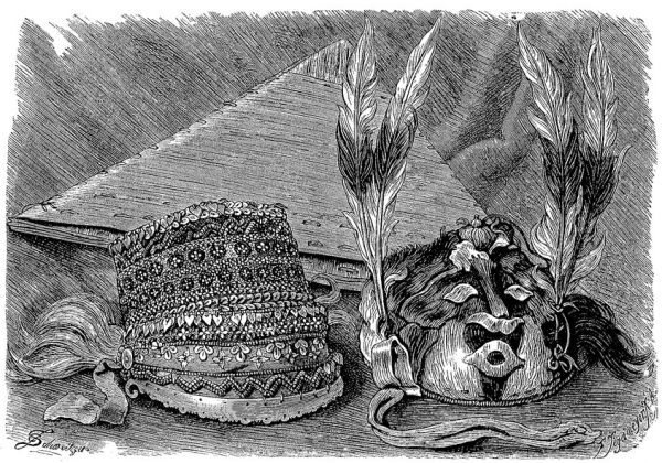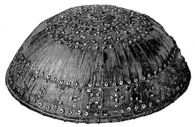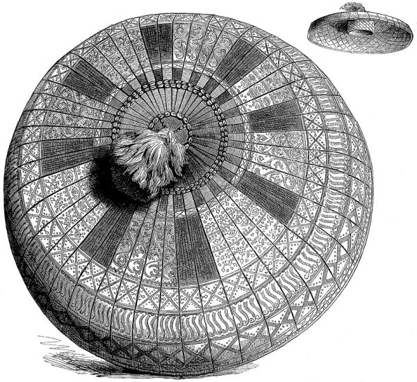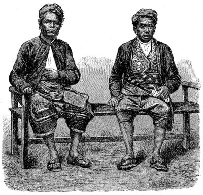 На Западной Яве прикрытием головы служит шапочка из [396] белого, голубого или чёрного глянцевитого шёлка; на Самаранге — платок, завязанный на макушке так, что два конца его выступают в виде крыльев. Ачинцы и некоторые горные племена Лусона носят своеобразную шапочку (см. рис., стр. 387), батаки — тюрбанообразный платок (см. рис., стр. 382); у жителей внутренней Суматры начальники племени прикрывают темя тростниковыми шапочками, вышитыми золотом.