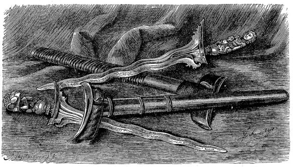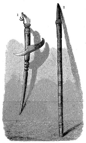 Главным оружием у малайцев магометан служит извилистый крис, национальное оружие сассаков Ломбока (см. рис. сбоку и стр. 406). Острие лезвия охотниками за головами предпочтительнее всего испытывается на волосах голени. Резные, украшенные золотом и драгоценными камнями рукоятки крисов принадлежат к своеобразным произведениям малайской художественной промышленности, на которых можно проследить постепенное превращение мифологических мотивов в простые орнаменты. Форма закалённого клинка в виде языка пламени, фигуры змей или драконов на рукоятке и украшения ножен придают крису значение оружия, тесно связанного с религиозными целями. На них часто вырезываются полезные изречения. В ножны вкладывают завёрнутый в лоскут талисман. Лина, оружие и рабочий инструмент горных племён Лусона, представляет короткий, в виде тупого треугольника, более широкий спереди клинок, с выпуклыми и вогнутыми ножнами, лежащими друг против друга. В могилах Явы попадаются [406] ножи в виде серпа полумесяца, рукоятка которых прикреплена к вогнутой стороне. И в других местах встречаются старинные ножи своеобразной формы, с выступами, напоминающими метательные ножи.