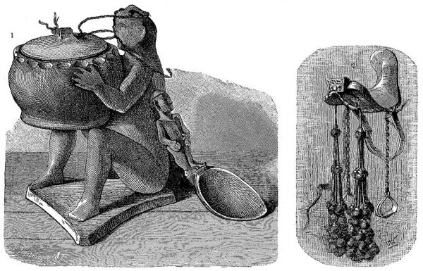 мастерских Востока. Для закалки привозится особое железо, например, в Борнео из Целебеса, и процесс сваривания с обыкновенным железом и травление производится с особою тщательностью. И малайцы в Сараваке на Борнео — искусные мастера железных изделий, в чём им не уступают обитатели юго-восточного берега, где Нагара заключает в себе большие оружейные мастерские; в Бруни и Сараваке обрабатываются также медь и золото. Батаки искуснее в обработке меди, чем железа, в чём их превосходят даже дикие даяки. Игорроты занимались прежде усиленной разработкой медных рудников, причём области разведок были тщательно разделены. Обитатели Банки не умеют выделывать железа, между тем как это искусство известно их ближайшим соседям. Кузнечные меха, сделанные из бамбуковых трубок, по системе двойного насоса, — те же, что и в Индии, и в Африке. Впрочем, вместе с ними д-р Ганс Мейер видел в [422] игорротской кузнице вертикальные меха из двух выдолбленных древесных стволов, с двумя духовыми трубками, выходящими у самого пола. Мартенс в одной малайской кузнице на Борнео нашёл следующие инструменты: молот, зубило, бурав и топор, но не видал клещей. С помощью молота и топора железо прикрепляется одним лишь расщеплённым ротангом к деревянной рукоятке, причём избирается вилообразная ветвь, и более тонкая боковая часть служит рукояткой. Золото на архипелаге добывалось в изобилии ещё до появления европейцев. Малайцы западных островов любят различные украшения из золота; даже батаки приготовляют искусные золотые и серебряные изделия филигранной работы. Кроме чеканки, там употребляется и выкладывание раскалённой стали