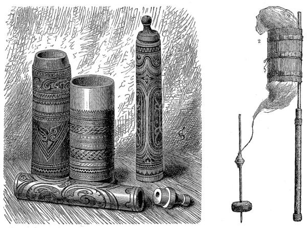 необходимости, жгут свечи из древесной смолы. У виколов большие раковины с травяной светильней представляют первобытную лампу. Гаген уверяет, что у батаков в Тобе он никогда не видал другого освещения, кроме огня очага и лампочки для опиума. Зажигание огня посредством трения деревянных палочек можно ещё найти у пастухов Явы, но у более цивилизованных племён в других местах для этого служат камень и трут; на Тернате из бамбукового осколка выбивают фарфоровым черепком искры на трут.
