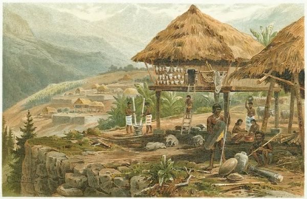 Защищённое положение отыскивается повсюду с замечательным чутьём. Из кампонгов или деревень батаков Суматры, илонготов и др. многие лежат почти на недоступных горных гребнях; особое предпочтение оказывается небольшим плоскостям, где расширяются гребни горных хребтов. В других местах устраиваются настоящие укрепления. В более ровных местах страны батаков во времена Юнгхуна почти все кампонги были окружены [409] высокими бамбуковыми палисадами, позади которых возвышались сторожевые башенки. Все это само собою приходит в упадок там, где нидерландское правительство положило конец внутренним войнам. Батаки устраивают безопасные жилища и в разветвлениях или искривлениях древесного ствола; при этом средние ветви обрубаются, а верхние оставляются. Лусонские илонготы также ставят свои хижины, сделанные из листьев пальмы-нипа и бамбука и опирающиеся на древесные стволы, под навесом дерева. Эти домики служат безопасным приютом для целой семьи. Оранг-сакеи и лубусы на Суматре также отчасти живут на деревьях.