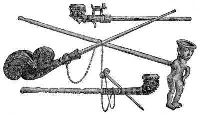 Национальным оружием повсюду, до самой Малакки, служит нечто среднее между охотничьим ножом и мечом (см. рис. на стр. 405 и 407.) Появившись позднее лука, духовой трубы и стрел (оно не замечается ещё на изваяниях Парамбанана, доходящих до XIII в.), оно, тем не менее, глубоко проникло в жизнь этих народов. Простую форму его мы видим в кампилане илонготов, которые, несмотря на свою бедность, искусны в обработке и закаливании железа. Нижнюю часть заострённого с одной стороны, слегка согнутого клинка они украшают золотой проволокой; верхнюю часть они укрепляют с помощью проволоки в рукоятке, обложенной медью. Для лучшего укрепления рукоятка обматывается насмолёнными нитками; деревянные ножны состоят из двух частей, связанных широкими тростниковыми полосами. К кампилану привязывается перевязь из тонкой ткани, на которой его носят через плечо или на поясе. Даже и в мелких подробностях здесь выступает сходство, не оставляющее сомнения в общем происхождении этого оружия: как боло игорротов (см. рис., стр. 407), так и мандау даяков повсюду представляет заострённый с одной стороны, слегка изогнутый клинок, с широкой спинкой, деревянной рукояткой, обмотанной проволокой, [405] деревянные ножны и шнурок в виде перевязи. Оно дополняется красивыми медными украшениями и красивыми сквозными узорами на спинке, богато вырезанной рукояткой и разукрашенными ножнами. У охотников за головами рукоятка усажена человеческими зубами. Дополнением этого оружия служит на нижней стороне ножен футляр из древесной коры, куда вкладывается маленький нож с длинной ручкой. Этим ножом даяк отрезывает головы своим жертвам и очищает с них мясо. У более бедных обитателей острова этот нож играет и самостоятельную роль в виде охотничьего и рабочего ножа; богатые и усердные добыватели голов вешают на стенах до полудюжины таких ножей в виде украшения.