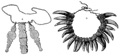 женщин напоминают пояса из шнурков Южной Америки. В пещерах Лусона находили браслеты из позвонков дюгоня, высоко ценимые микронезийцами. И в центральной Суматре украшения обручённых девушек, кроме серёг, состоят из узких серебряных колец, надеваемых на сгиб и на нижнюю часть руки, часто по двадцать и более, достигая локтей. Не обручённые девушки могли носить серебряные кольца только на одной руке, а женщины вовсе не должны были носить их. Юноши на Формозе с гордостью носят браслеты из кос добытых ими голов китайцев. Даяки считают чрезвычайно красивым иметь большие отверстия в ушах, с деревянными кружка́ми или тяжёлыми серебряными кольцами, так же как и батаки из Тоба и лусонские игорроты, отдающие особое предпочтение зубам крокодила (см. рис., стр. 399 вверху). И в верхней части ушей даяков красуются красные лоскутки ситца и т. п. Как скоро даяк отличился в добывании голов, он имеет право носить в ушах два клыка леопарда; на Лусоне число палочек в ушах указывает число отрубленных голов. Ниясец, добывший одну голову, получает шейное кольцо из проволоки со многими кольцами, вырезанными из ореха Lodoicea Sechellarum. У жителей Формозы, подчинившихся китайскому влиянию, браслеты и серьги, а также и стеклянные бусы, мало находятся в употреблении, но «дикари» Формозы носят в ушах тяжёлые подвески из бамбука, камня и металла, повязки из раковин на лбу и тонкие медные браслеты. Серамцы часто отличаются таким множеством подвесок из бус, что впечатление наготы совершенно сглаживается; и тингианы в Лусоне носят тяжеловесные массы пёстрых [402] бус или камешков, вывозимых с островов Батанес. В сравнении с ними, употребляемые на Флоресе ожерелья из ярких фиолетовых цветов Calotropis gigantea производят весьма изящное впечатление. Предметы украшения предков, так же как и их оружие, считаются ценным и традиционным семейным достоянием, имеющим мистическое значение — таким образом с течением времени являются амулеты (см. стр. 455).