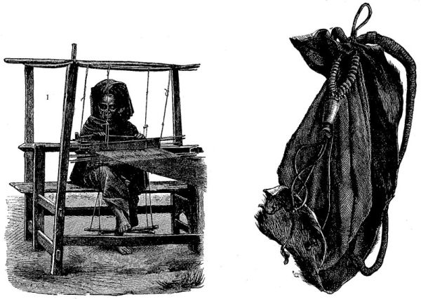 Прядение и тканьё пользуются широким распространением. Прялка и веретено напоминают родственные им европейские орудия (см. рис. 2, стр. 420). Даже даяки изготовляют превосходные ткани из хлопка на простом стоячем станке, который связывается из двух жердей и прислоняется наискось к стене дома; батаки умеют даже вплетать в свои ткани золотые нити (см. выше, рис. 1). Во всяком случае, эта работа требует много времени. Уоллес считает, что узкая ткань для саронгов в руках туземной ткачихи на Южном Целебесе увеличивается в день не более, как на один дюйм. В Сурабайе и Макасаре существует обширная ткацкая промышленность, связанная с искусным окрашиванием. Бесцветные узоры обозначаются жидким воском, или на куски ткани нашиваются куски банановых листьев, всё вместе свёртывается и погружается в различные краски. Таким образом получаются поразительные рисунки. Ява доставляет чёрные саронги, какие любят настоящие малайцы, Макасар — цветные ткани, Пауанг — шали (сленд-янги) с прелестными узорами, нередко вышитые золотыми и серебряными нитями, употребляемые женщинами для головных уборов (см. [423] табл. «Ткани и оружие малайцев»). Плетёные корзинки, сумки и шляпы из волокон пандануса или некоторых пальм попадаются даже на европейских рынках. Манильская конопля, абака, возделывалась на Лусоне ещё до прибытия европейцев. Материи из древесной коры, потребление которых регрессирует уже в течение столетия, изготовляются всего более племенами Борнео и Суматры. Совершенство тонкой, как бумага, полинезийской тапы достигается материями Целебеса. Малайская тапа по толщине напоминает кожу или трут.