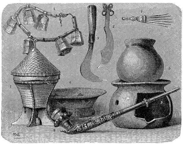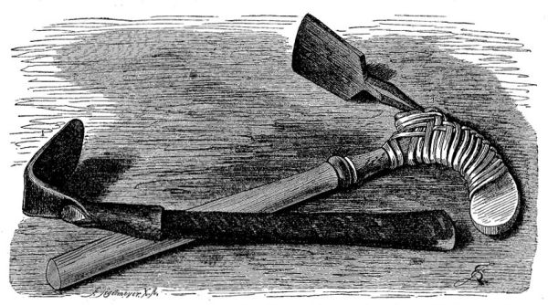 Земледельческим орудием, рядом с мандау, которым расчищаются кустарники и срезаются стебли, служит мотыга, деревянный клинок которой прикрепляется крестообразно завязанными сухожилиями или лыком к твёрдому влагалищу, а это последнее — к длинной, изогнутой, нередко разукрашенной рукоятке (см. рис., стр. 415). Женщины работают менее крупными ножами; и игорроты жали рис небольшим дугообразным ножом, срезывая каждый стебель отдельно (см. рис., стр. 414). Скрепление деревянных ящиков и изготовление факелов производится с помощью смолы, собираемой в лесах; в некоторых местностях собирают также каучук, воск диких пчёл и даже съедобные птичьи гнёзда. Точно также срезывают ротанг, который необходим населению для постройки хижин и судов и изготовления многочисленной посуды. Кроме того, он составляет такой выгодный предмет торговли, что туземные правители на Борнео сделали его предметом монополии.