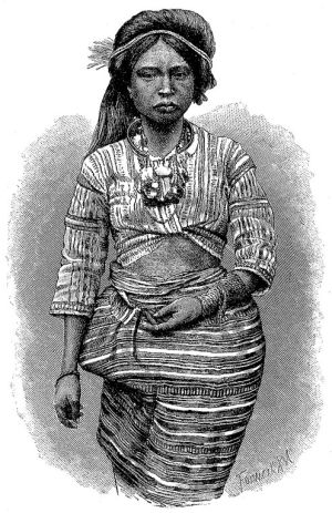 Одежда малайцев заключается в пределах между обнажённостью и закутанностью, так как над простотою дикого народа распространились разные арабские и китайские влияния. Там, где население меньше всего затронуто ими или сдерживается ленью, мы находим наиболее простое состояние. Но мы видим, что оно всё более и более отступает и что даже самые отсталые горные племена Филиппин, передник которых не доходит до колен, отчасти уже носят одежду (см. рис., стр. 387 и 394). По рассказам, головорезы Лусона, илонготы округа Принсипе были дикарями, одежда которых составлял широкий пояс из выбитой древесной коры, а мальчики и девочки ходили там до полной возмужалости совершенно обнажёнными, но и они в соседних христианских деревнях появлялись не иначе, как в шароварах и рубашке. И у жителей Формозы мы видим то жалкий передник, то обильную одежду, смотря по времени года и работе. Между тем как на самой Суматре лубусы, ещё лет десять тому назад носившие узкий пояс из древесной коры, одеваются теперь наподобие батаков, древесная кора и шкуры и теперь ещё играют видную роль в обширных областях Борнео. И [394] серамцы носят просто пояс из коры; у женщин к нему привешивается передник из бамбуковых прутьев. Даже и дети, ходящие вообще без одежды, носят такие передники.