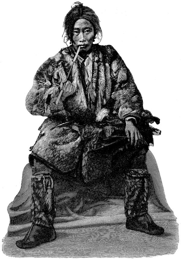 Одежда северных азиатов преобладанием меха или кожи походит на одежду эскимосов, но гораздо разнообразнее. На востоке можно проследить китайские влияния на тунгусах, и орочонах, например, в отношении обуви (см. фиг, 24 и 28 на табл. «Утварь и украшения гиперборейцев»). Всего своеобразнее одежда тунгусов, заостряющаяся сзади в виде фрака, с меховой верхней одеждой, вышитой бусами, и богато расшитым нагрудником. Под нею носят нечто вроде полукафтана непосредственно на теле, а сверх всего верхнюю меховую одежду, которая у самоедов состоит из более светлых, а у долганов и тунгусов из более коротких и тёмных оленьих шкур. Для покрытия головы употребляются шапки по большей части из лисьего меха, но самоедки носят капюшоны, отороченные чёрным собачьим мехом; олений хвост на капюшоне позволяет издали отличать самоедов от их юракских соседей. Береговые обитатели носят доходящие до туловища меховые сапоги, примыкающие к шароварам, вроде купальных панталон, между тем как охотники вместо сапогов надевают нечто вроде гамаш, облекающих бёдра и соединяющихся с обувью, которые к одежде, покрывающей [680] туловище, прикрепляются кожаными ремешками. Самоедские женщины носят на бёдрах до полудюжины медных поперечных обручей, прикреплённых к шароварам, а на грудной части их нижней одежды бренчат всевозможные металлические подвески. Шейные повязки из беличьих хвостов в виде боа употребительны у тунгусов. У этого народа женщины носят юбки из голубой ткани с красными выпушками, шапки в виде чепчика, вышитые серебряными нитями и высеребренные медные пояса. Практическою особенностью неизбежных меховых рукавиц служит разрез у основания большого пальца, чтобы его можно было легче выставлять и крепче захватывать им.