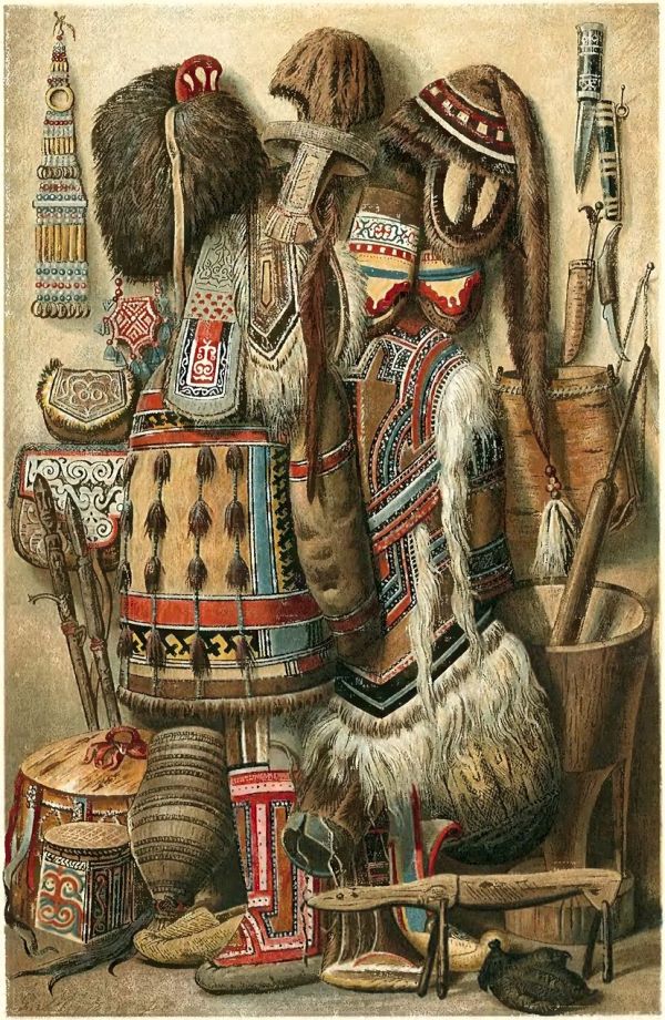 Шапка и одежда шамана увешана фетишами; кроме того, длинный ремень висит позади от шапки до самого низа. При заклинаниях он надевает одежду, сшитую из шкур, украшенную в виде подвесок лоскутками, ремешками и всевозможными фигурами животных. Им предоставляется без вреда для себя брать в руки вещи, внушающие страх, подобно тому, как творцы легенд дают в руки ведьм средства, по большей части возбуждающие отвращение, каковы части мёртвого человека, пауки и тому подобные животные, причём все это применяется к делу втайне или в ночное время. Нам напоминают Австралию известия, сообщаемые Миддендорфом, что один береговой юрак возил с собою высушенное в виде мумии тело отца в качестве домашнего идола.