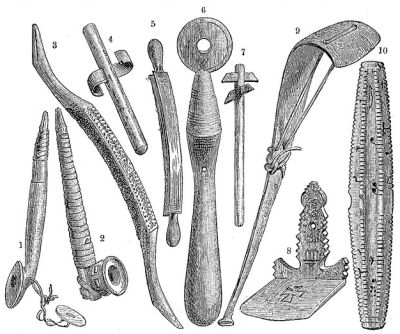 Музыкальных инструментов у них немного. У них есть барабаны или, лучше сказать, бубны грубой работы, в которые бьют во время пляски (см. рис., стр. 580). Трещотки из оленьих зубов, челюсти соболя и копыта косули вешаются для успокоения, а может быть и в качестве амулета, у колыбели детей тунгусов. Песни, прославляющие подвиги предков и героев, возвращение солнца и т. п., поются в особенности в летнее время: один поёт с акомпанементом барабана строфу, а хор подтягивает заключение её. У лопарей всё ещё живое народное творчество воспевает все события деревни или стоянки и превращает их в песни или в фантастические рассказы.