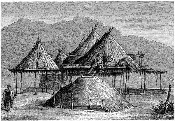 Земляные хижины часто встречаются в Камчатке, а в остальной Северной Азии в тундре всегда служат зимними жилищами. Они выкопаны на 1—2 метра в глубину и покрыты дёрном. В середине земляного бугорка остаётся открытым отверстие, которое является в одно и то же время дымовой трубой, окном и дверью (см. рис., стр. 686). Толстый брус с нарезками служит вместо лестницы для входа и выхода. Сбоку уже у самой земли проделана другая дверь для женщин. Вход, в особенности в хижинах тундр, часто бывает извилистым для предохранения от снежных заносов. В этой хижине живёт камчадал и кочевник тундры от начала октября до половины мая. Обыкновенно в ней помещается одна семья и ближайшие её родственники. Как говорят, только у самоедов-язычников живёт по две семьи в одной хижине.
