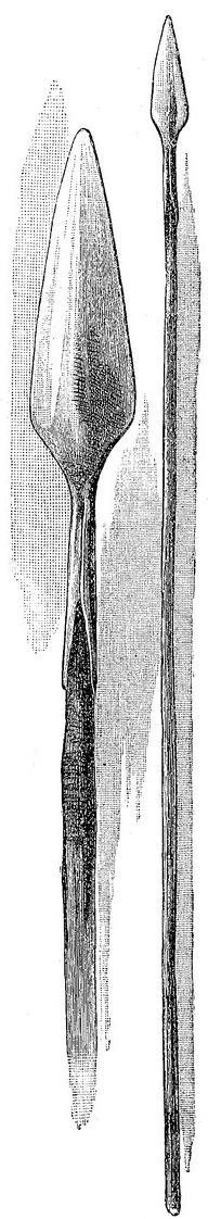 Оружие другого рода у пигмеев можно видеть только случайно. Большие «наконечники стрел», которыми они бьют слонов, принадлежат к распространённым во внутренней Африке массивным слоновым копьям. Их охотничьи ножи по своей форме подходят к такому же оружию их соседей, но никогда не бывают так богато украшены. Изображённый выше (стр. 762) нож, рукоятка которого сделана из кости человеческой ноги, представляет нечто единственное в своём роде. Копья (см. рис., стр. 761) они местами получают от своих соседей, в особенности, если последние, как, например, фаны, являются настоящими копьеносцами. То же самое можно сказать и о щитах, которые были найдены у них на Чуапе и в стране басонгов. Это не мешает им, впрочем, как рассказывает Стэнли, изготовлять щиты для своих соседей.