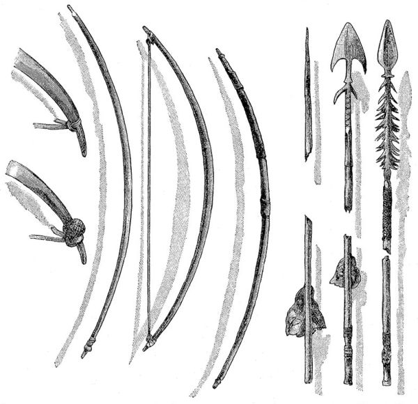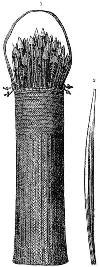 у них замечательно мало; в качестве амулетов они, по-видимому, носят безразлично те или другие предметы. Они не обрабатывают железа и, по сравнению со своими соседями, меньше пользуются им. Почти повсюду они являются опытными стрелками из лука. Лук и стрелы (см. рис., стр. 758 и 760) составляют их оружие, в числе которого копья попадаются редко. Стрелы их небольшие, с деревянным стержнем, расщеплённым внизу и нередко обмотанным железом. Наконечники стрел широки, всегда снабжены желобком и часто зазубринами. Колчаны у них — простые мешки, сплетённые из камыша, подвешиваемые на короткой кожаной петле. У них больше, чем у многих негров этой области и у акков, обнаруживается влияние искусных в плетении мангбаттов. Быть может, их властители давали им свои лучшие стрелы, или заказывали для них такие стрелы, чтобы им легче было доставать обильную добычу. Форма лука их близко подходит к форме, употребительной у их соседей, поэтому короткий, сильно изогнутый, с тетивой из пальмовых волокон или ротанга лук лесных негров принадлежит к числу этнографических признаков большей части этих племён. Чтобы тетива не соскальзывала назад, вочуи носят подушечку на сгибе кисти.