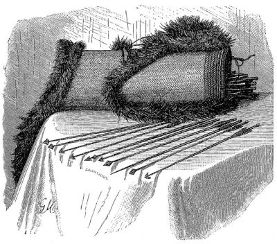 Намазывание стрел ядом, по-видимому, у этих маленьких народов распространено более, чем у других негров. Висман, а также и Стэнли упоминают о тёмной, смолообразной массе с запахом шпанских мушек. По мнению последнего, это растение представляет вид Arum’а; из него таинственно, во тьме лесов, приготовляется яд. Наконечники стрел густо обмазываются им и обёртываются листьями. Франсуа слышал об отравлении стрел трупным ядом на Чуапе, а Стэнли упоминает ещё о светло-жёлтом яде для стрел, добываемом, вероятно, из красных муравьев: именно, запасы таких муравьев были найдены между жердями крыши хижин авизиппов, [763] употреблявших этот светлый яд. От укола остриём в виде иглы в правую грудь смерть от этого яда, как говорят, наступает через минуту; некоторые раненые умирали через несколько минут, а другие через несколько дней. Симптомами отравления были слабость, сердцебиение, судороги со стискиванием зубов и пот по всему телу. Южные батуи сохраняют яд в склянке, привешенной к поясу. К охотничьим снарядам принадлежит и кожаный пояс (из буйволовой кожи?) с ножом для снимания кож; женщины носят корзинки на перевязях из кожи буйвола.