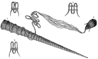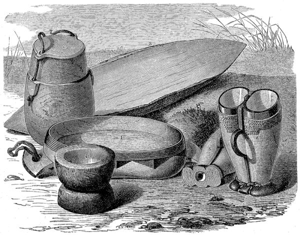 Утварь и оружие овамбов (см. рис., стр. 223) сделаны очень тщательно. Из дерева выделываются блюда, ложки и сосуды для питья. В виде земледельческого орудия у них употребляется только короткая мотыга. Из их оружия особенно замечательны кинжалообразные ножи с рукояткой и ножнами из дерева и кожи, отчасти украшенные медными бляхами или плоской отделкой из медной проволоки. Их постоянное вооружение состоит из ассагаев и кирри. Лук и стрелы, встречающиеся теперь довольно редко, походят на подобное же оружие гереросов, имеют полтора метра длины и изготовляются из гибких листовых черешков Hyphaene ventricosa. Стрелы снабжаются костяными или железными наконечниками и, по свидетельству Шинца, неизменно отравляются млечным соком Apocynacee. Колчан овамбы носят под левой рукою на ремне,