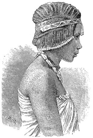 Одежда у более бедных состоит из куска шкуры или местного плетения, обвязанного вокруг бёдер, а более зажиточные носят только фасенду (бумажную материю), привозимую с берега, которая облекает мужчин от пояса до колен или икр; у женщин эта покрышка гораздо короче, настолько, что Ливингстону они казались почти обнажёнными. У богатых дам полоса фасенды висит сзади, как шлейф, который носит за ней невольница. Эти дамы, скорее с целью украшения, чем прикрытия, носят кусок леопардовой шкуры или фасенды на груди. Пояса из чёрной кожи ценятся довольно высоко. У женщин выпиливаются оба верхних средних резца в виде полукружия и выбиваются соответственные нижние. Татуировка, которая у них более употребительна, чем у киоков или сонгов, распространяется на грудь, руки и живот; расписывание всего тела, по большей части четырёхугольными фигурами из белой глины или белыми точками и крестами, встречается во всей области Лунда. В торжественных случаях тело натирается и растительным маслом. У мужчин фантастические причёски представляют всё, что можно придумать в этом отношении. Знатные лица носят в виде кос или рогов торчащие назад и наперёд парики из бус, которым придаётся особенная ценность, и муата ямво дарит их своим начальникам. В его собственном парике воткнуто красное перо [242] попугая. Подобно тому, как лунды на Лулуа для украшения своей причёски втыкают в неё на затылке палку длиною в фут с пучком из перьев, в бороду вплетаются соломинки, придающие ей такую же длину. Женщины стригут себе волосы и, кроме того, выстригают на середине, над лбом, треугольник, вершина которого лежит на темени; в торжественных случаях они вплетают в волосы бусы (см. рис. ниже). Так же как у женщин, у рабов волосы коротко острижены. Обычай втыкать в носовую перегородку или в ушную мочку кусочки тростника нельзя назвать общераспространённым; точно также употребительные в стране Касаи медные и железные кольца на руках и голенях в Лунде встречаются реже. Важную роль, отчасти даже политического характера, здесь играет лукано, браслет, обмотанный слоновыми сухожилиями (см. стр. 245 и 247). Шнурки из бус на шее, а также рога и другие талисманы, приходится видеть часто; мужчины нередко носят на голове деревянные полумесяцы, наподобие диадемы.