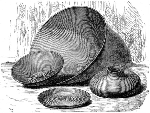 Плетёные работы жителей царства Баротсе-Мабунда заслуживают величайшей похвалы. К самым простым принадлежат шарообразные мешки для зернового хлеба, изготовляемые из травы или из коры баобаба, и затем корзины в виде цилиндрической трубки, снабжённой деревянной или кожаной ручкой у отверстия, наглухо закрытой внизу, сделанной из коры и сшитой лыком. Плетёные работы в более тесном смысле слова представляют корзины-макулуа, изготовляемые из листовых частей веерообразной пальмы. Они имеют причудливые, разнообразные формы и со своей плотно закрывающейся крышкой вполне соответствуют назначению запирающихся ящиков или ларцов. К лучшим ручным работам принадлежат корзины макенке, которые баротсы плетут из трудно поддающихся обработке корневых волокон куста, похожего на клён; один из их видов снабжён плотной, входящей в выемку крышкой. Украшения делаются с помощью вплетаемых волокон с тёмной окраской. Среди кухонной утвари первое место занимают сосуды из глины без ручек, простой, но весьма правильной формы. Некоторые из них отличаются более тёмными и более светлыми украшениями, а другие — тем, что они отшлифованы, но не глазированы. Глиняные сосуды в виде урн, употребляемые для хранения хлеба, имеют исполинские размеры. Между тем как глиняные сосуды являются по большей части работою женщин, деревянные сосуды выделываются мужчинами, преимущественно мабундами. Все деревянные сосуды внутри и снаружи выжигаются железными инструментами и имеют густой чёрный цвет. Высушенная корка различных видов тыквы, часто превращаемая в сосуды, также снабжается иногда выжженными рисунками (см. рис., стр. 230).