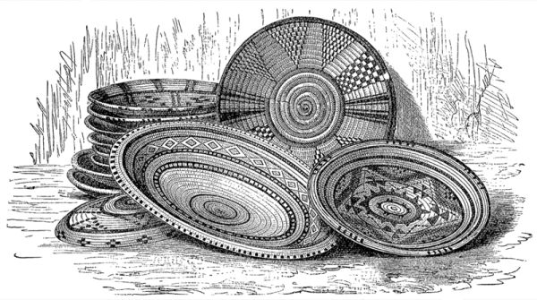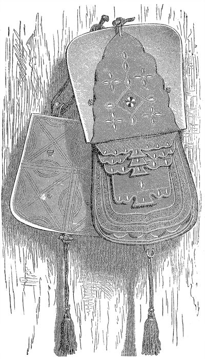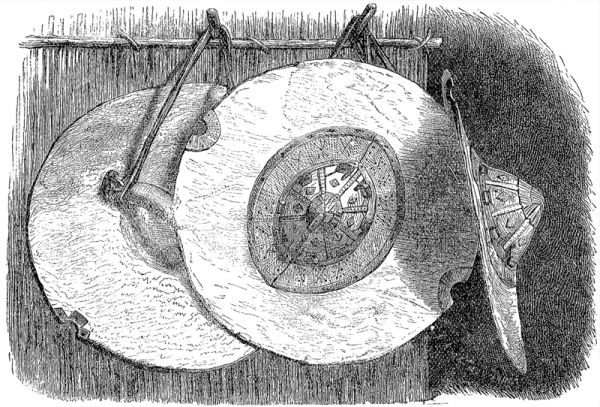 Вытекающий отсюда как необходимость смешанный характер суданского населения отражается не менее того в замечательном перемещении их культурных состояний. Припомним только совпадающие отчасти с исламом и язычеством различия одежды и жилищ. Повсюду, куда проникла культура, одеждою суданского населения является арабско-маврская, с немногими изменениями. Основу её составляют складчатые широкие шаровары, на которые иногда идёт до 20 метров бумажной материи в 0,5 метра шириною, и просторное тобе. Пышность, роскошь [529] обнаруживаются не в большем разнообразии надеваемых одежд, а в малоостроумном обычае — надевать на себя несколько тобе, одно на другое, пока обременительность и некрасивость этой сложной одежды не положит этому предел. В основе своей тобе — не что иное как широкая рубашка с особенно широкими рукавами, сшитая обыкновенно из узких, не шире ладони, полос бумажной ткани, дальше которой не идёт ткацкое искусство Судана. Вышивка грудного кармана и ворота служит украшением этого платья, простого по цвету, белого или индиго-синего, светло-голубого и тёмно-синего. Украшения бывают обыкновенно белого цвета. В Западном Судане, где красильное искусство стоит выше, чем в Борну, замечается большое разнообразие цветов. Наиболее ценимые тобе привозятся из Нупе и Кано, каково, например, тобе, составляющее одежду знатных лиц, изображённое на рисунке, стр. 516, а также сильно пропитанные индиго тёмно-синие, разглаженные между валами, твёрдые и блестящие тобе короробжи. Цены между бумажными и шёлковыми тобе колеблются от 2,5 до 50 талеров Марии Терезии. Особенным богатством работы и украшений отличаются небольшие вышитые шёлком рубашки богатых женщин. Но элементами женской одежды всех сословий являются шаль, обёрнутая вокруг бедер, и накидка, прикрывающая верхнюю часть тела. Для обеих применяется блестящая, крепко прокатанная материя тобе короробжи; женские рубашки делаются также из голубой материи. Для обуви (см. рис., стр. 520 и 528) служат у богатых башмаки мавританского образца из красной или жёлтой козлиной кожи, которые ещё украшаются шёлковыми вышивками. Бедные ходят босиком или носят простые сандалии из буйволовой кожи; серебряные кольца для рук и лодыжек, ожерелья из настоящего и фальшивого жемчуга, янтаря и агата, серебряные кольца с вделанными в них жемчужинами или благородными кораллами в одном из крыльев носа, составляют самые обычные предметы украшения. Мужчины ходят обыкновенно с непокрытой головой; только у канембов есть тюрбанообразное головное прикрытие. Природа негров позволяет им подвергать безнаказанно гладко выбритый череп в течение нескольких часов действию солнечных лучей. Женщины кануриев носят волосы, располагая их различным образом в виде небольших, прилегающих друг к другу растрёпанных на концах косичек, причём лоб и виски высоко выбриваются. Такова же причёска и женщин канембов. У жён состоятельных людей украшение волос завершается серебряной пластинкой в виде полумесяца.