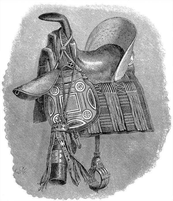 Но этим ещё не исчерпывается вся сила Борну. Каждый принц, чиновник и придворный держит, чтобы поднять своё значение в глазах правителя и народа, полки и отряды, которые находятся в распоряжении властителя. Среди этого войска особенно выделяется тяжёлая кавалерия в своих длинных кафтанах на толстой вате (см. стр. 582), сверх которых надето несколько тобе (см. рис., стр. 516) различного цвета и со всевозможными украшениями, в шлемах из лёгкого металла, разукрашенных развевающимися перьями, на боевых конях, одетых в «либбеди» — толстые одеяла из разноцветной полосатой ткани. Голова лошади покрыта спереди металлической пластинкой. При Рольфсе (1866 г.) начали в Куке отливать небольшие орудия.
